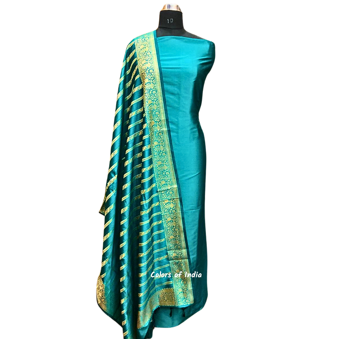 Indulge in timeless Banarasi charm with our Banarasi Silk Blend Unstitched Suit Set, crafted to perfection for festive and wedding wear.
